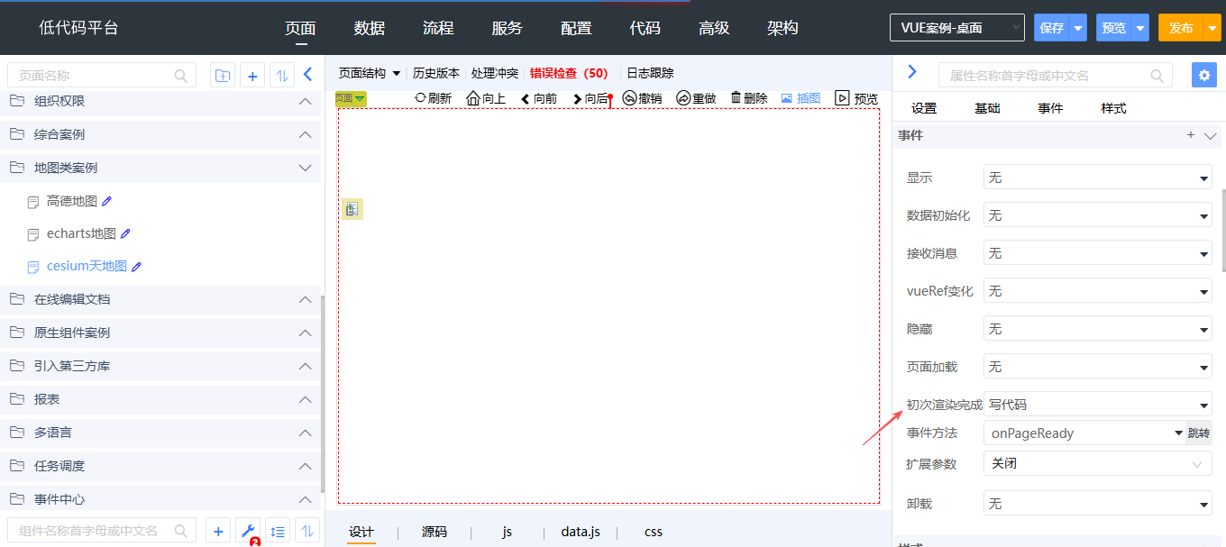 在页面组件的“初次渲染完成”事件中写代码,显示地图
