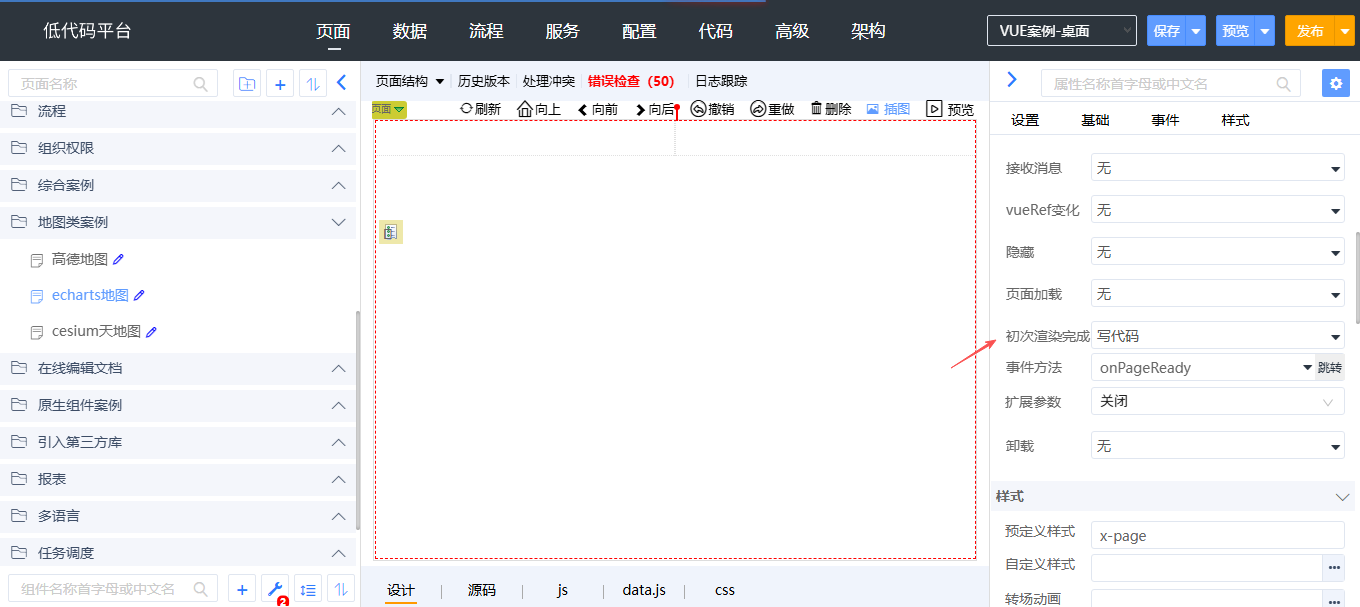 在页面组件的“初次渲染完成”事件中写代码,显示图表