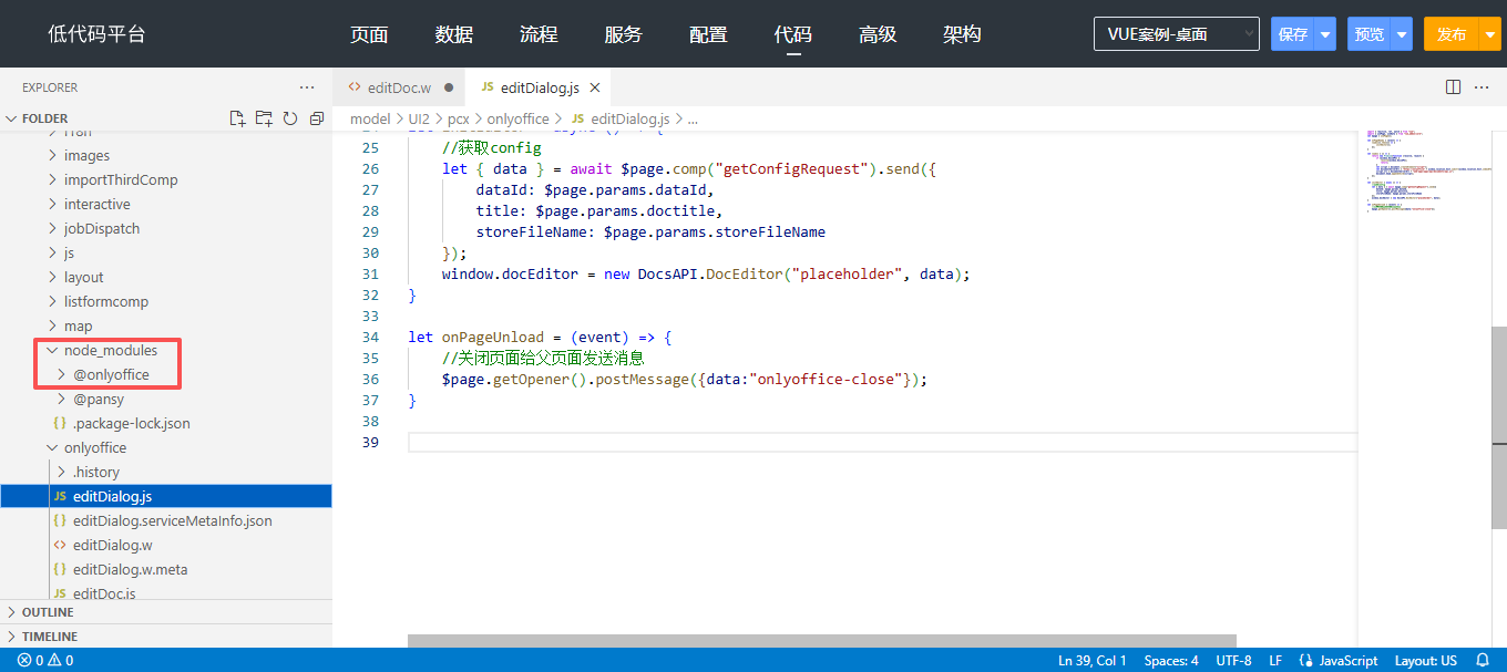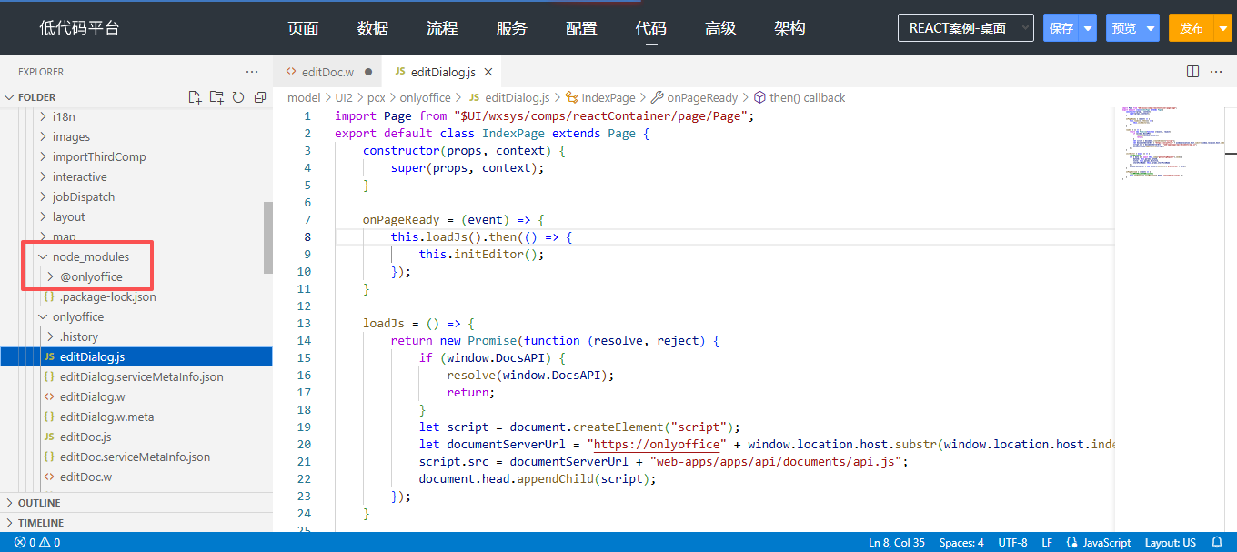 安装 npm 包 @onlyoffice/document-editor-react,将生成的 @onlyoffice 目录复制到 IDE 中的 model/UI2/pcx/node_modules 目录下,如下图所示。引入 npm 包参考《引入第三方 npm 包》