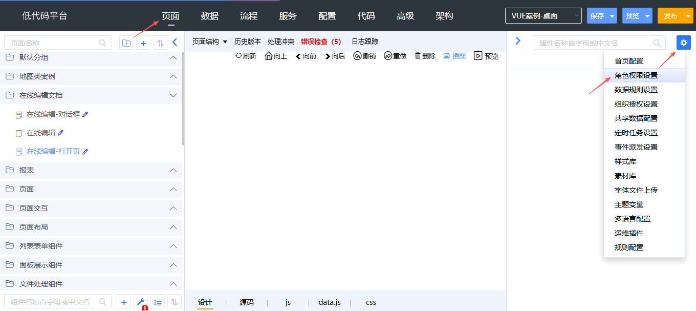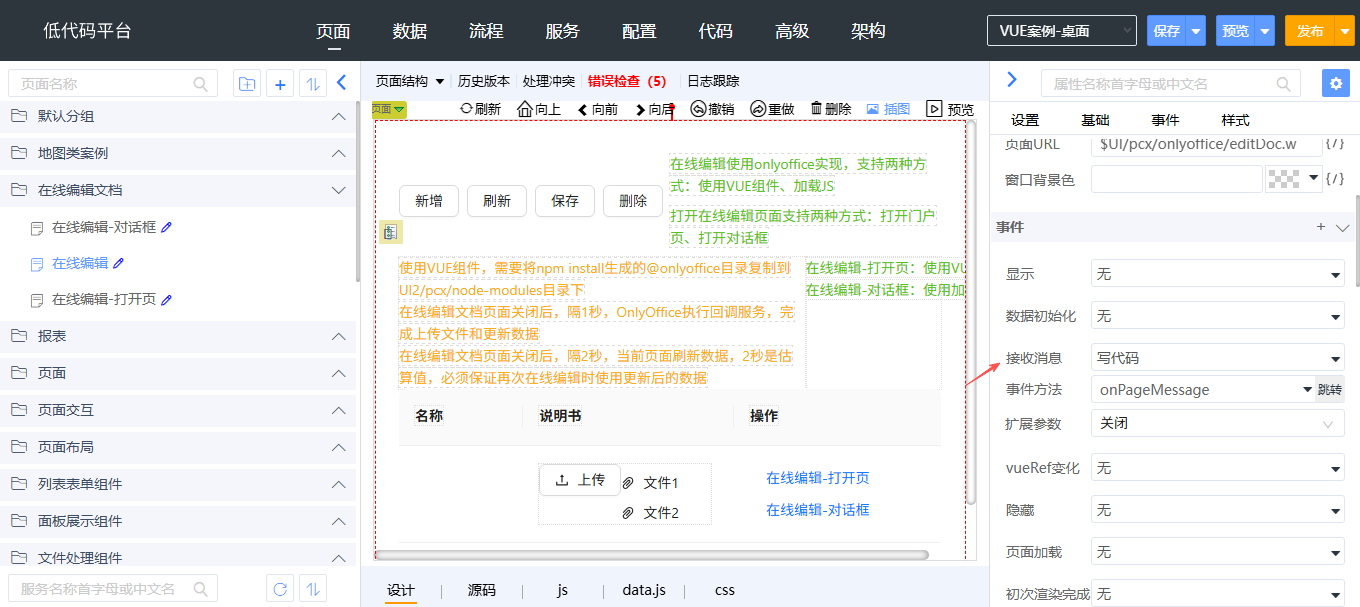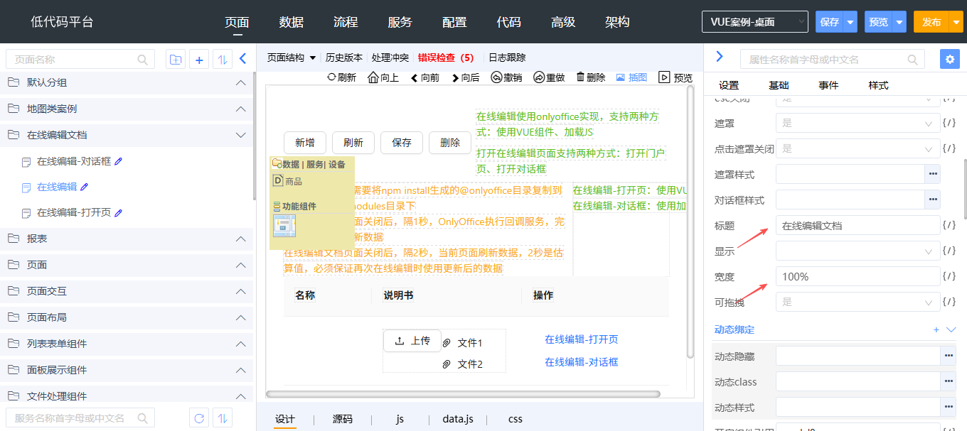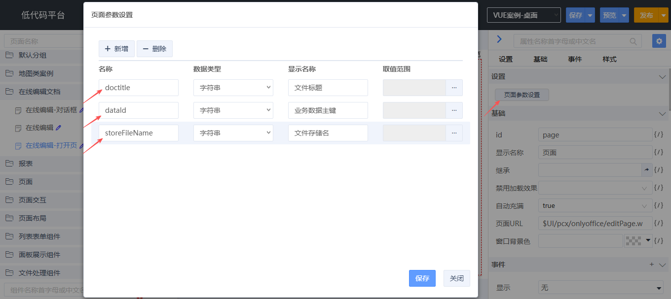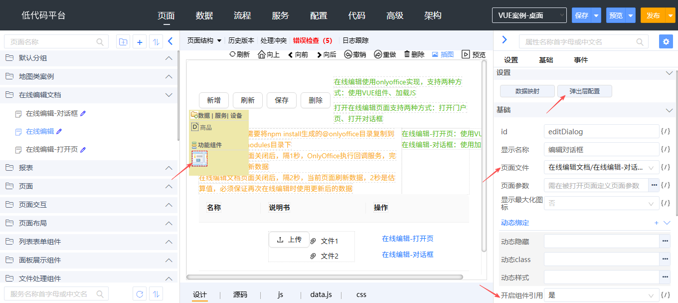 在页面上添加对话框组件,页面文件属性选择文档编辑器页面,开启组件引用,如下图所示