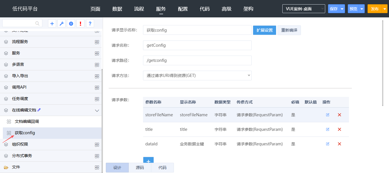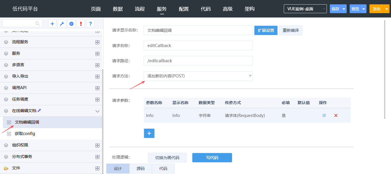 在服务中,添加“文档编辑回调”服务,请求方法设置为 POST,添加一个请求体参数,如下图所示