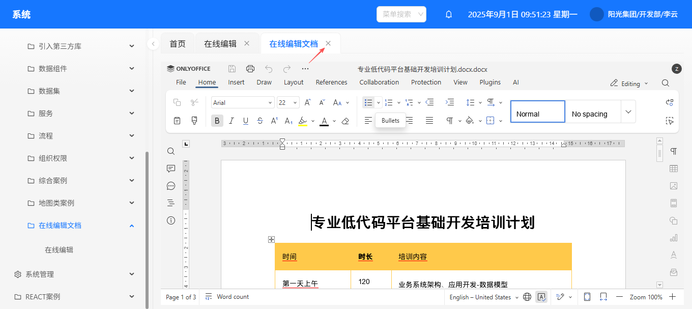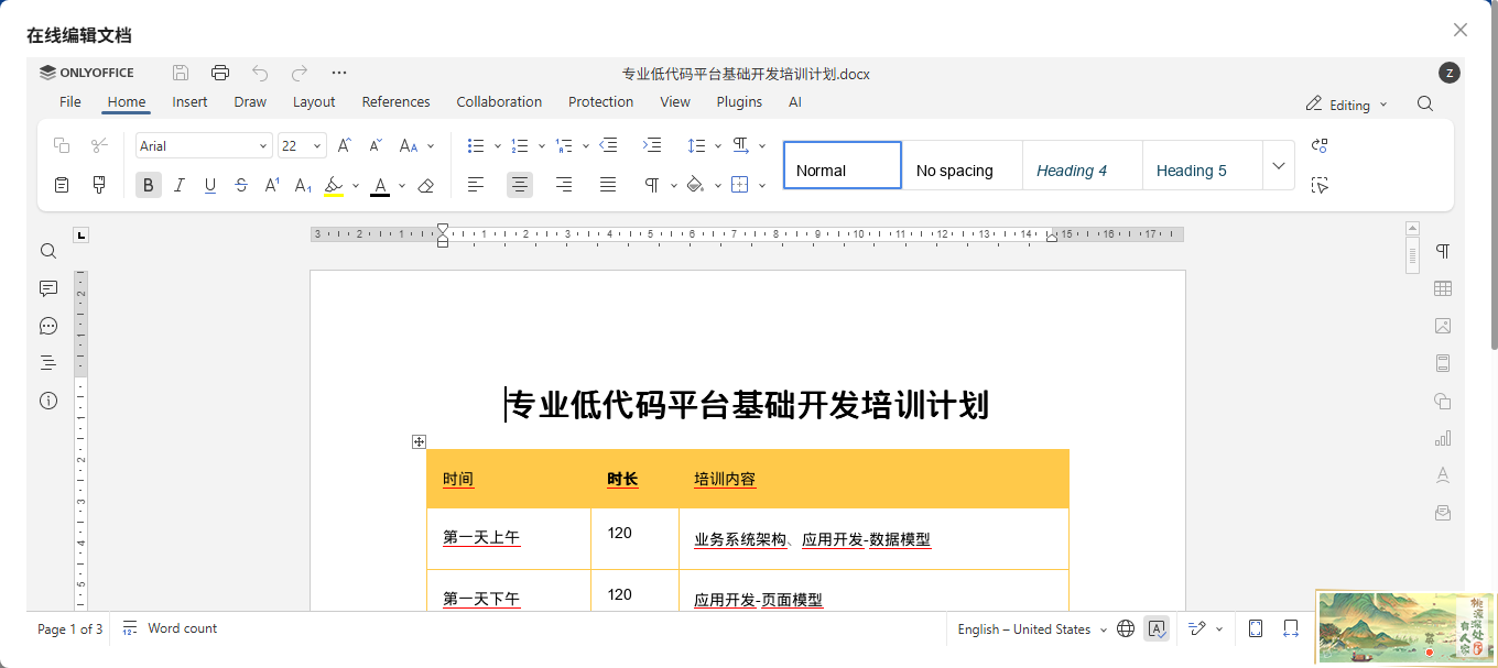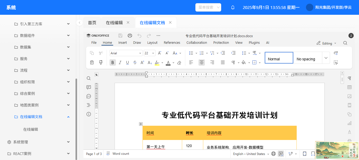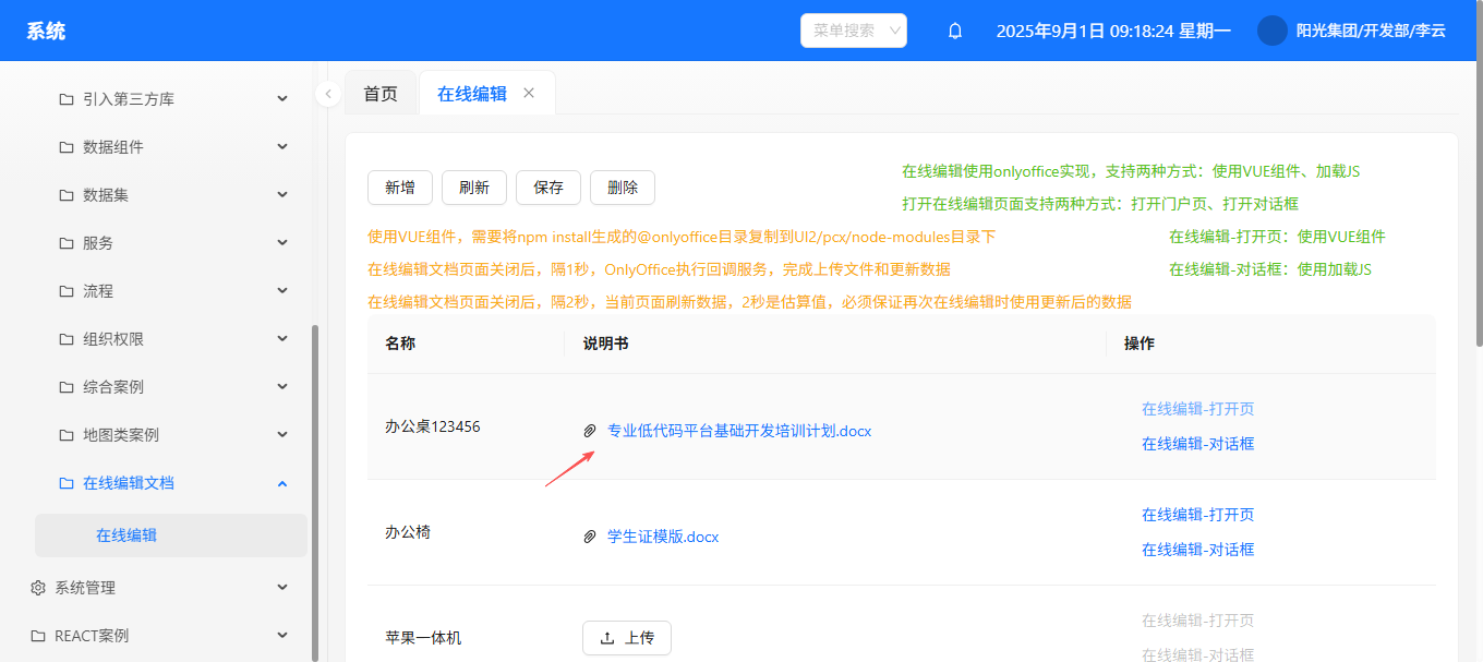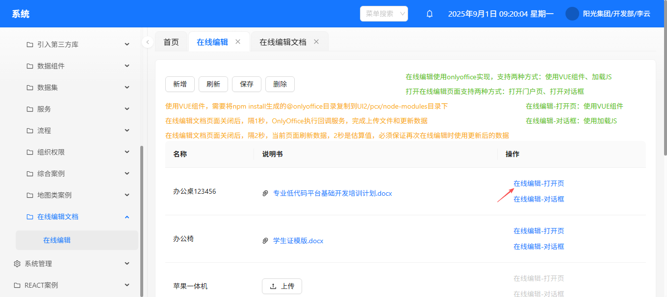 平台测试过的 onlyoffice 有两个,7.3.3, 9.0.4;如果要使用9.0.4,需要先使用7.3.3启动起来(数据库等都初始化完成),然后再切换成9.0.4;直接使用9.0.4有数据库初始化问题。