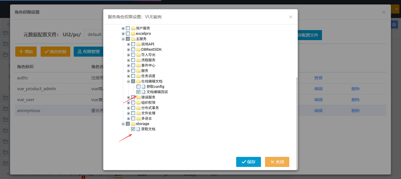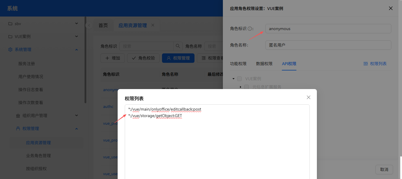 由于 OnlyOffice 需要打开文档和调用回调服务,因此以下两个 API 需要设置匿名用户访问权限