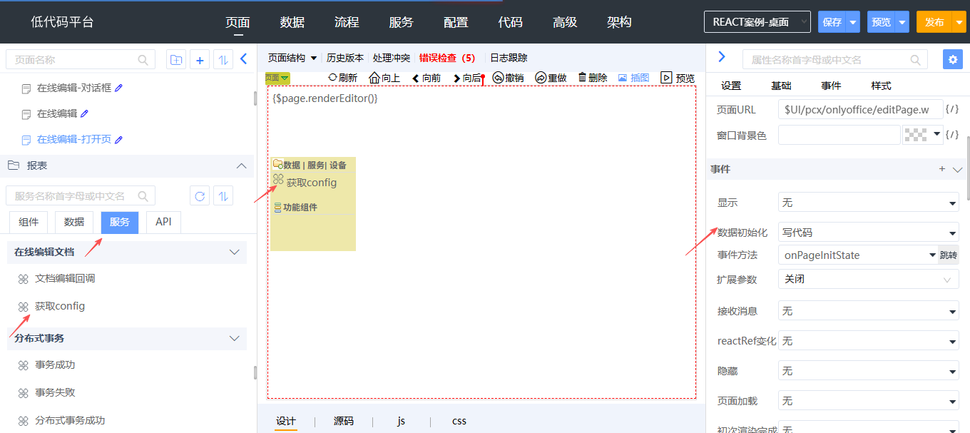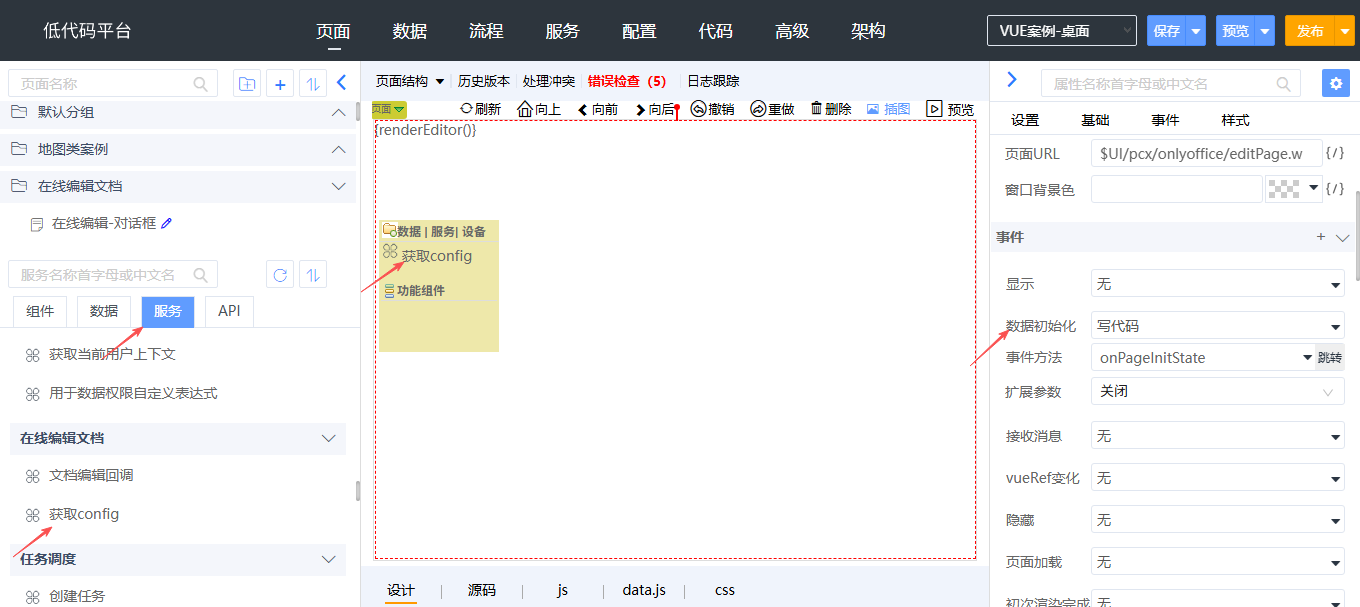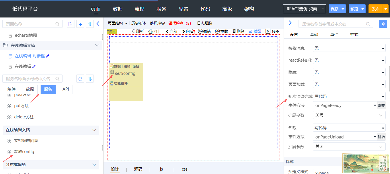添加“获取 config”服务组件,添加页面的初次渲染完成事件,如下图所示