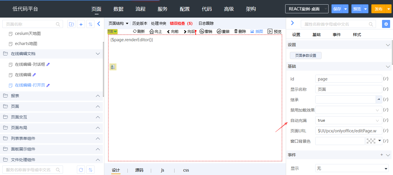 页面组件设置自动充满属性为 true 即可,如下图所示