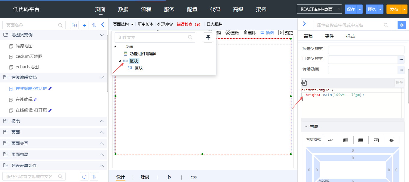 对话框组件的高度依赖内部组件的高度,在页面上添加区块组件,设置高度为 calc(100vh - 72px);,对话框的高度即可充满整个浏览器。文档编辑器放在这个区块中即可