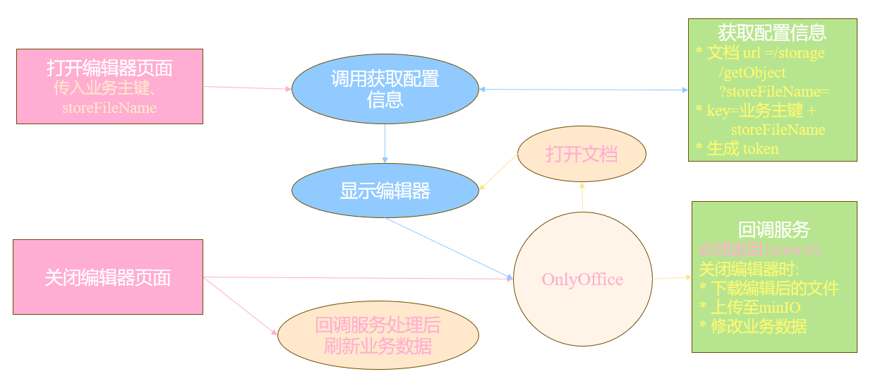 打开文档编辑器页面 | 1 在获取配置信息服务中: 根据 storeFileName 生成文档 url 根据 storeFileName 和业务主键生成 key 根据 OnlyOffice 要求生成 token 2 在回调服务中: 返回{"error":0} |