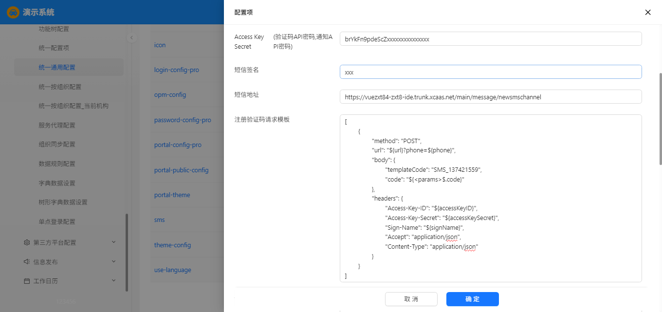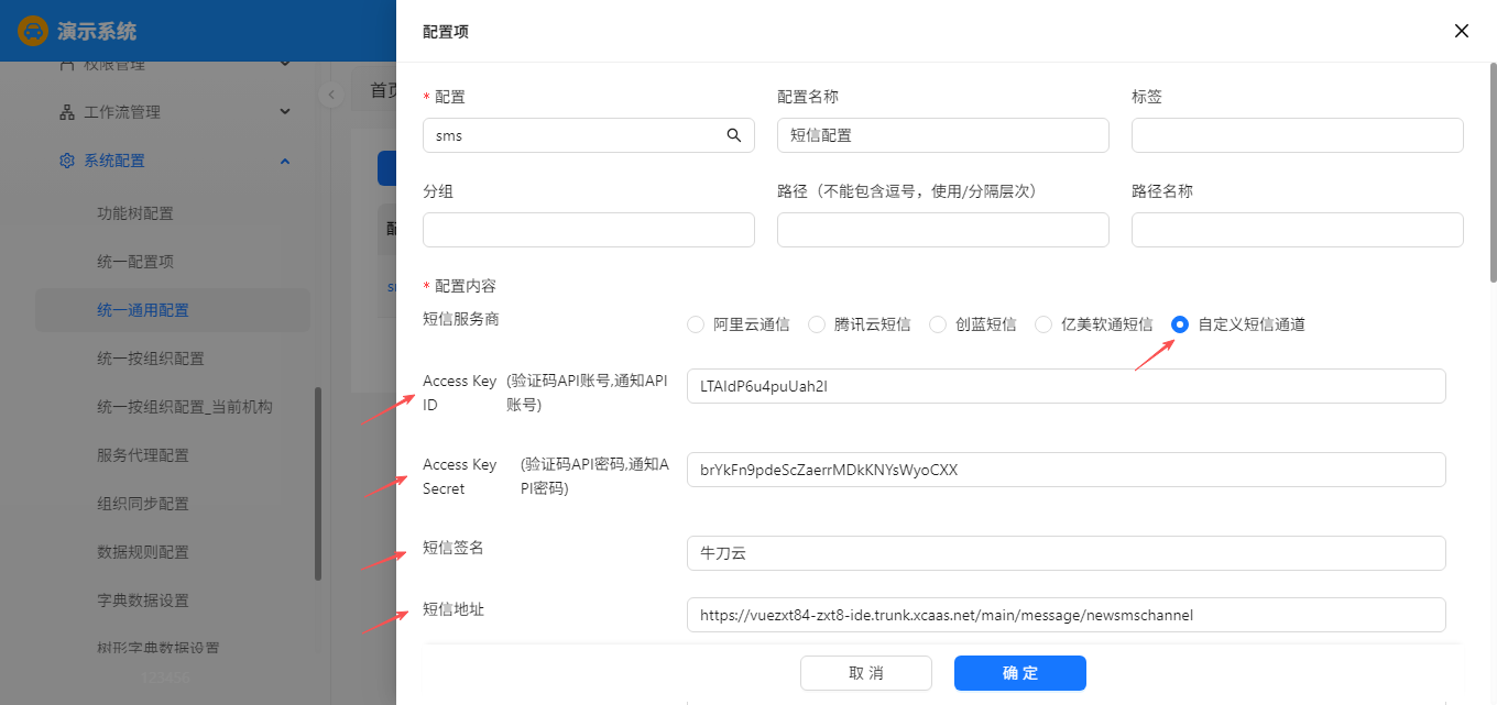 - 在短信通道配置中配置的 accessKeyID、accessKeySecret、signName、url