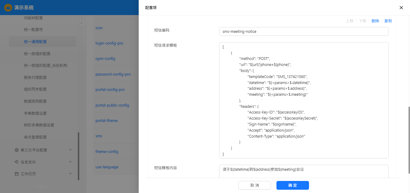 | 短信地址 | url | 如果调用租户内应用中的服务,应用的域名需要使用内部域名,进入“企业门户应用-服务注册”页面,查看应用的内部域名 |
