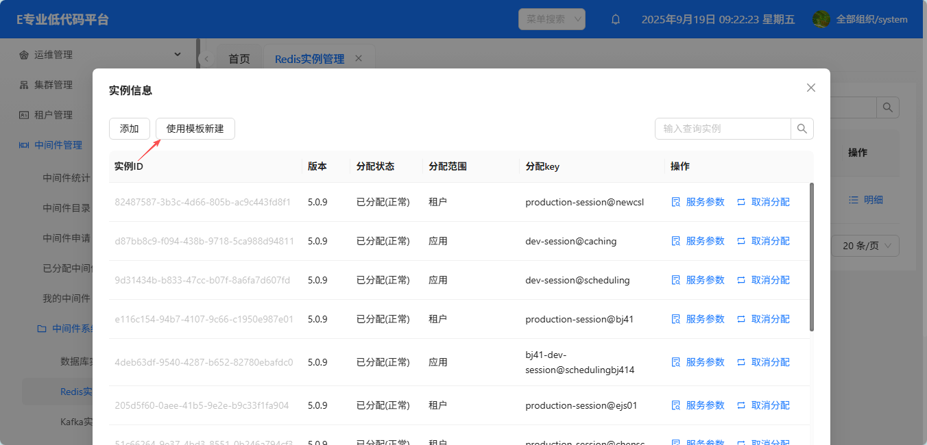 在实例列表中,如果没有可分配的实例,需要新建 Redis 实例。点击“使用模版新建”按钮,如下图所示