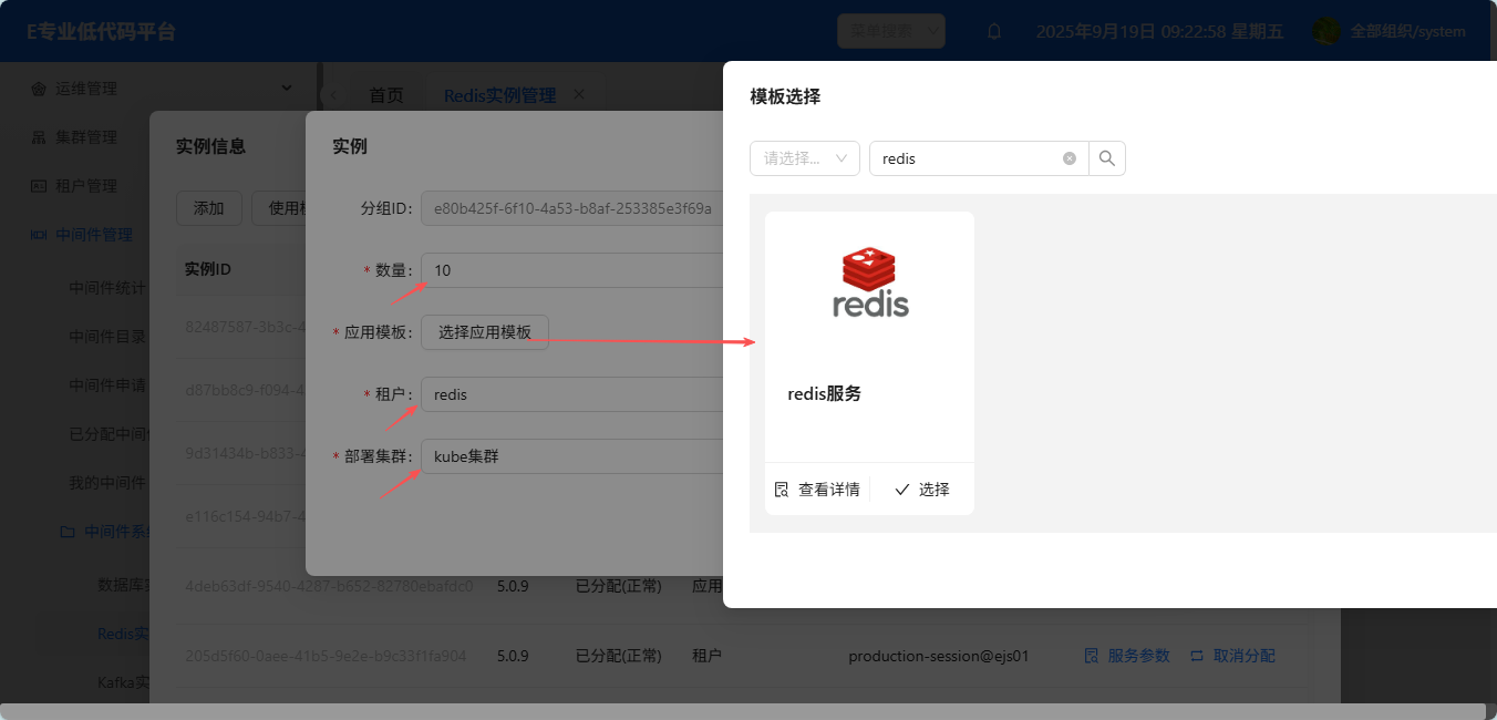 - 应用模版:点击选择应用模版,选择 redis 服务