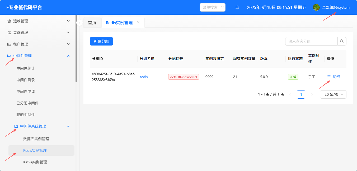 使用 system 登录控制台,打开“中间件管理→中间件系统管理→Redis实例管理”,如下图所示