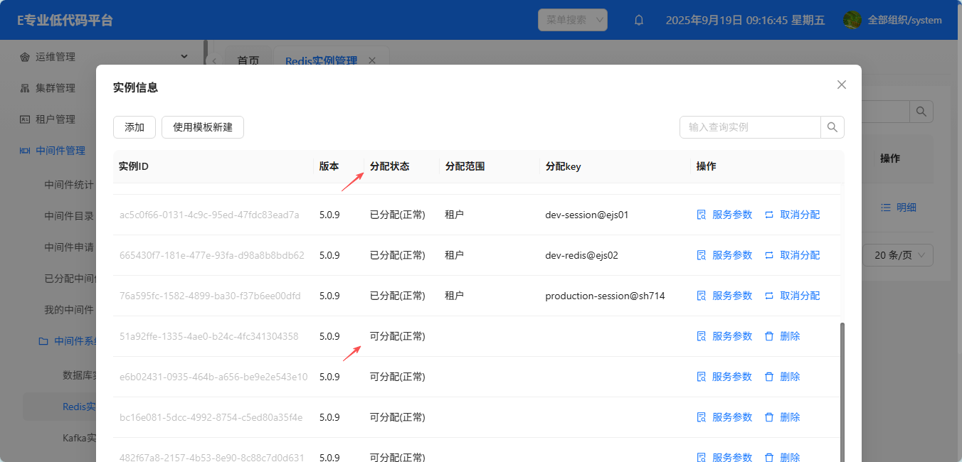 点击列表中的明细按钮,打开实例信息对话框,检查分配状态中是否有“可分配”的实例,如果有可分配的实例,如下图所示,不用新建 Redis 实例,可以直接添加任务调度、事件中心等应用