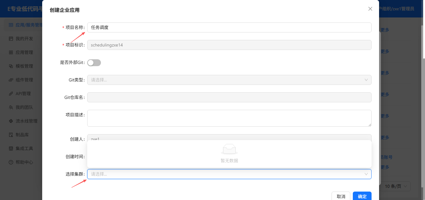 任务调度、事件中心等应用需要使用 kube 集群,租户中如果没有分配 kube 集群,在添加任务调度等应用时,选择集群为空,如下图所示,此时需要给租户分配 kube 集群