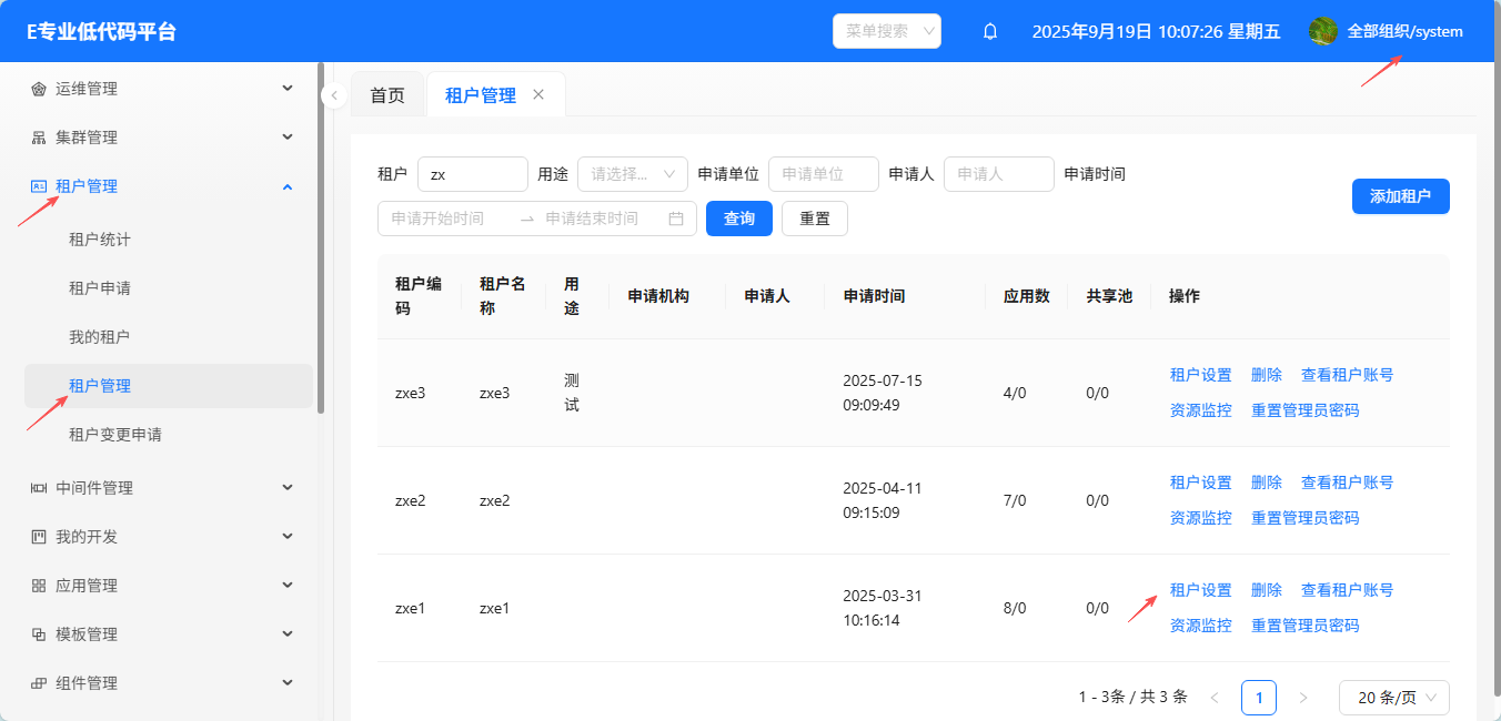 使用 system 登录控制台,打开“租户管理→租户管理”,找到租户,点击租户设置按钮,如下图所示
