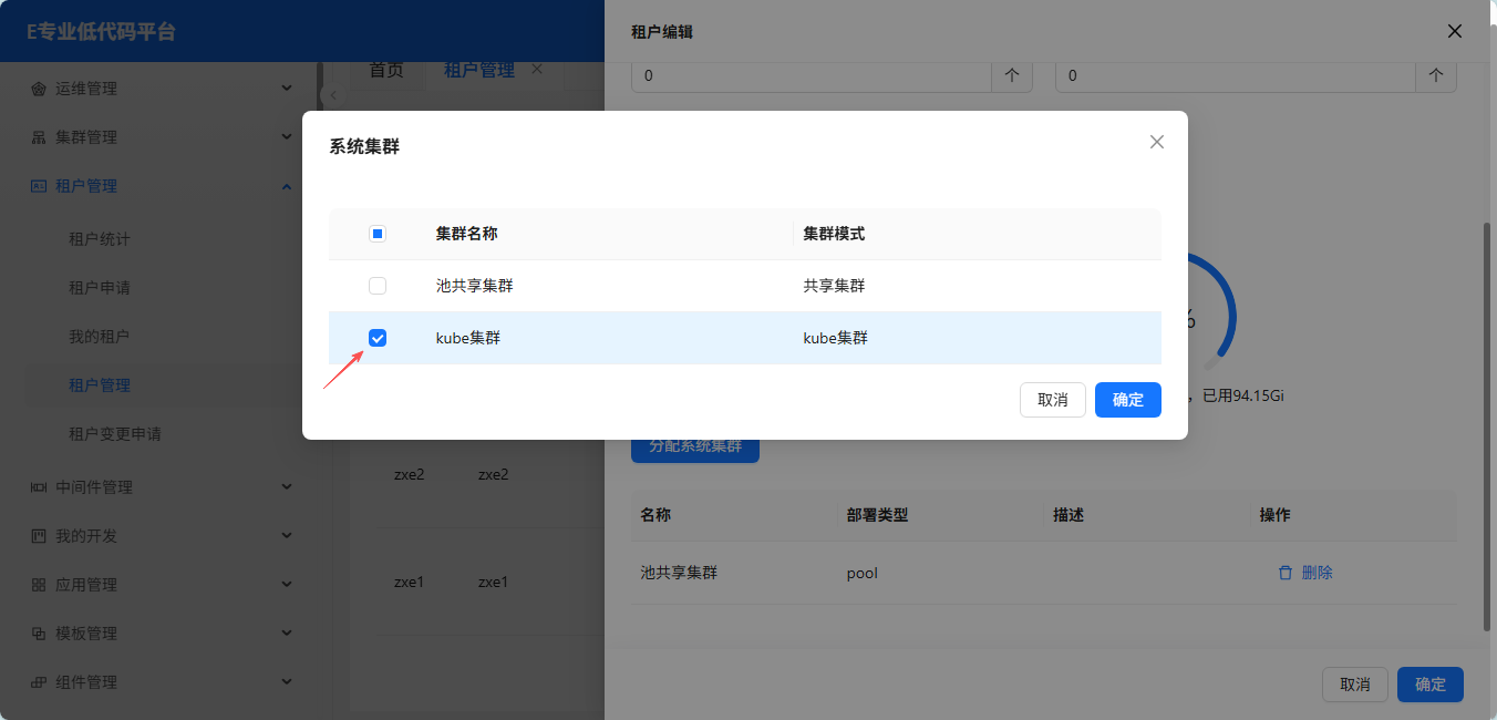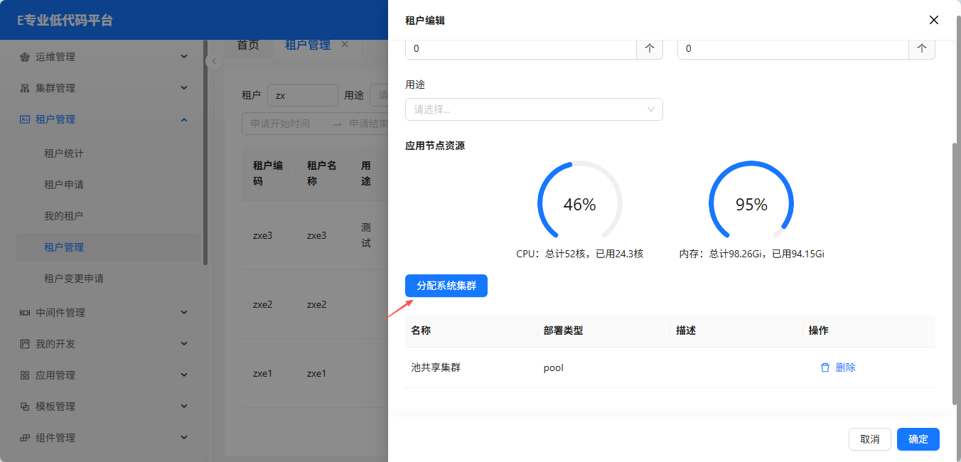 在弹出的租户编辑抽屉中,点击分配系统集群按钮,如下图所示