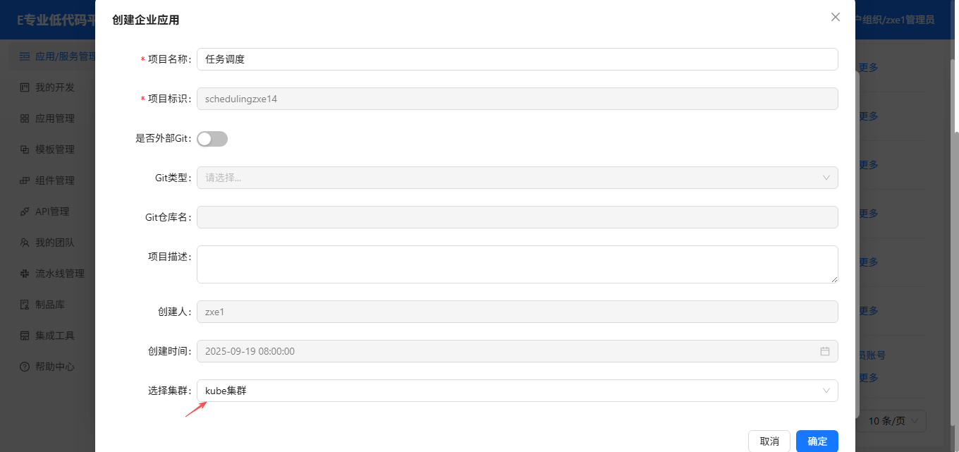 租户中添加 kube 集群中,添加任务调度等应用时,选择集群中显示 kube 集群,此时可以添加应用了