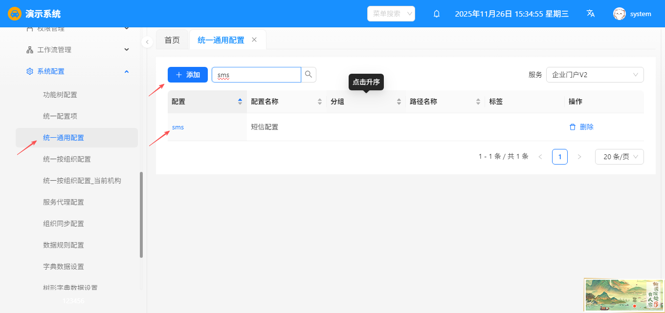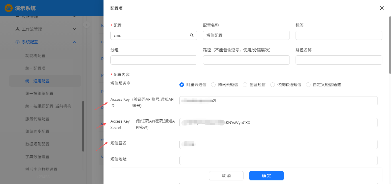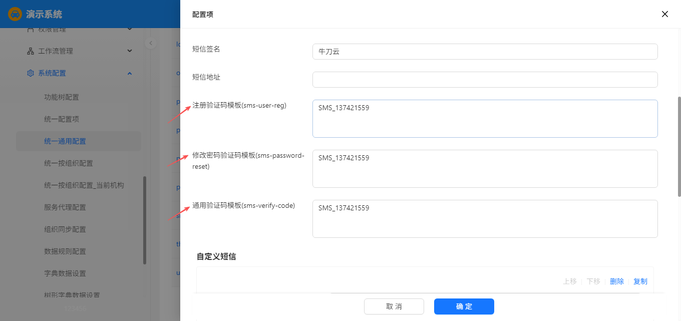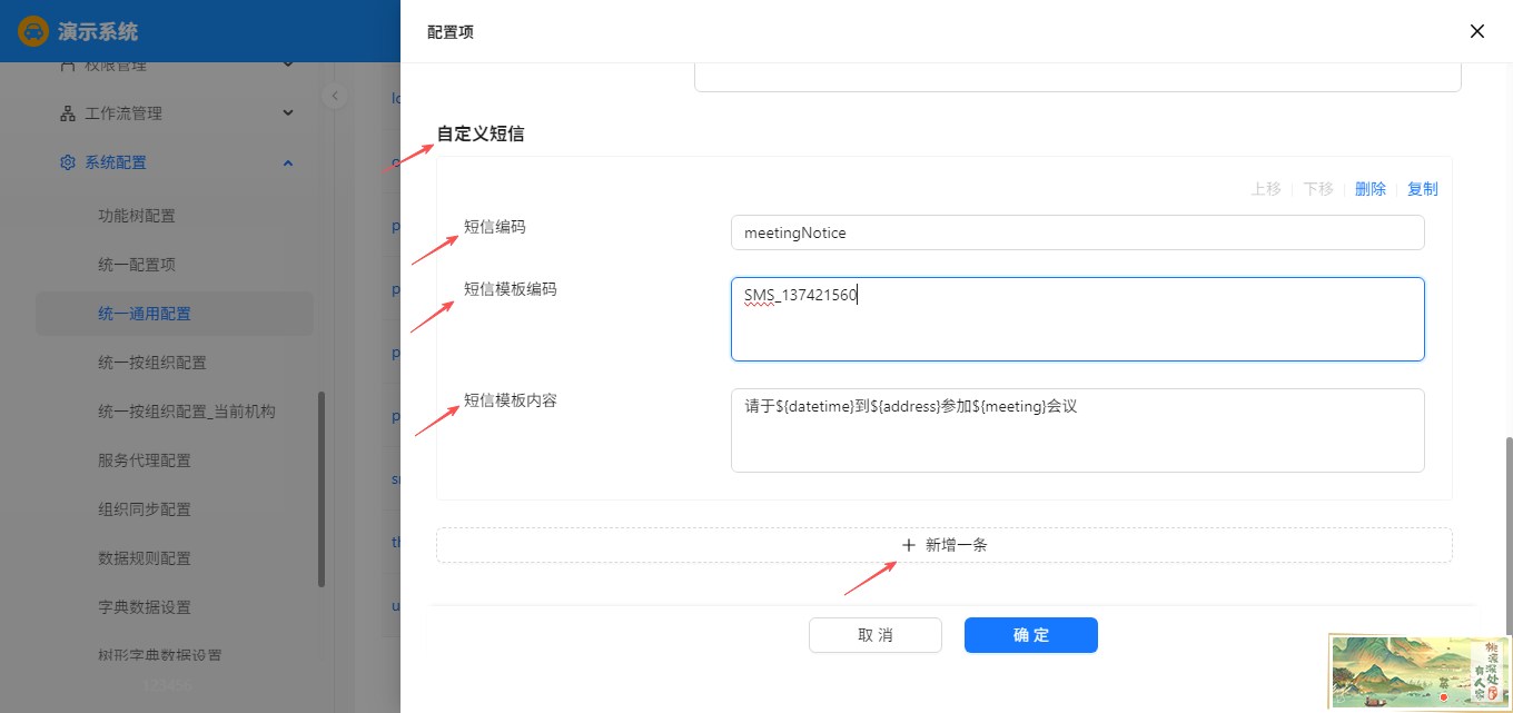 打开“系统管理→系统配置→统一通用配置”,添加“短信配置”,如下图所示