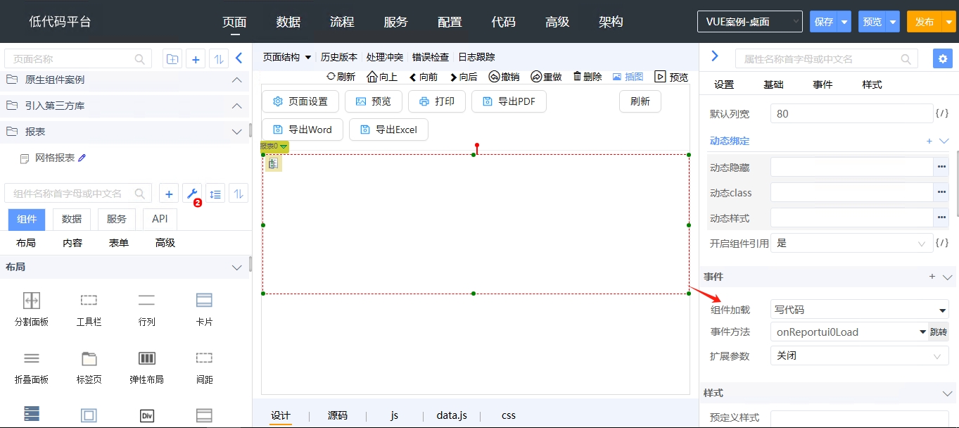 如果要修改默认的纸张、边距、方向等可以通过代码的方式在页面的“初次渲染完成”事件实现,具体如下: