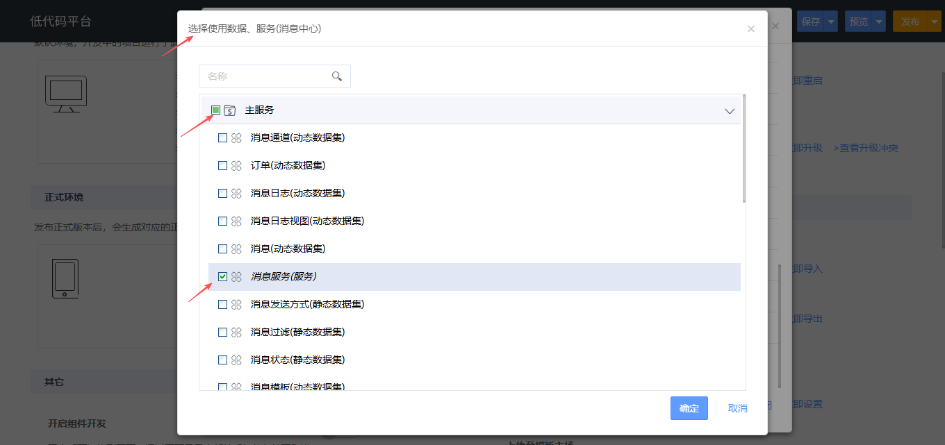 选中主服务下的消息服务(服务),点击确定按钮,如下图所示