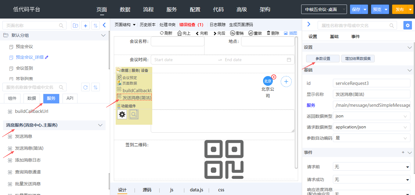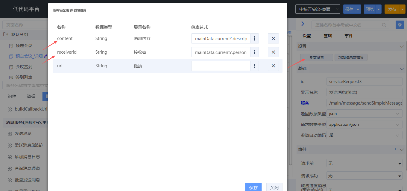 在页面中添加发送消息(简洁)服务,设置参数,如下图所示