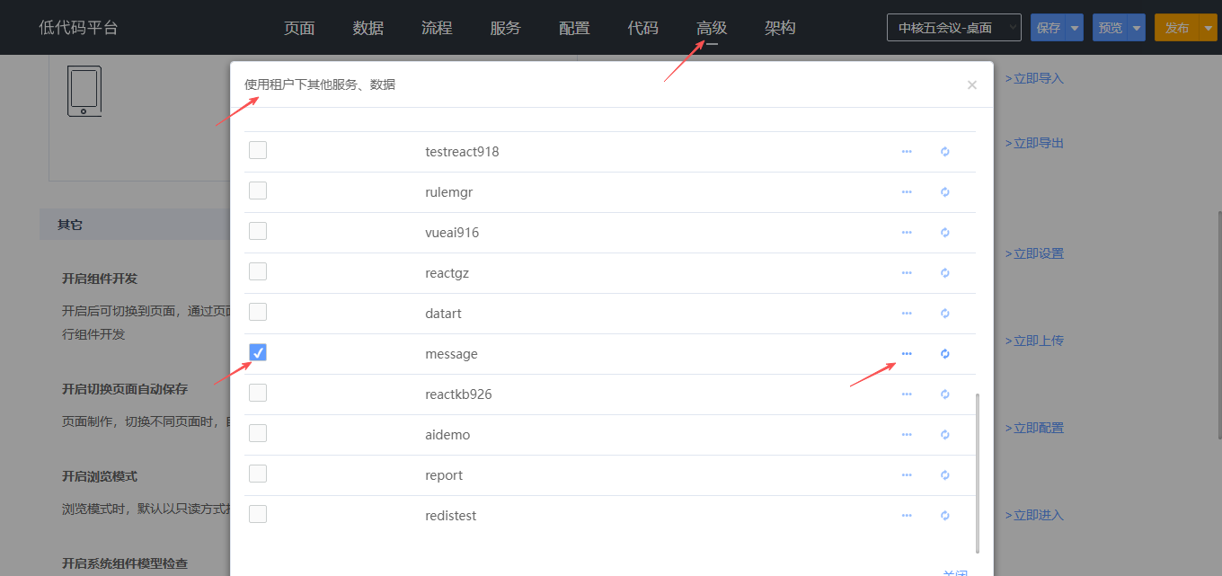 切换到高级页,点击“租户内跨应用调服务、数据”,弹出“使用租户下其他服务、数据”窗口,选中 message,点击操作列中的“选择使用服务和数据”图标,如下图所示