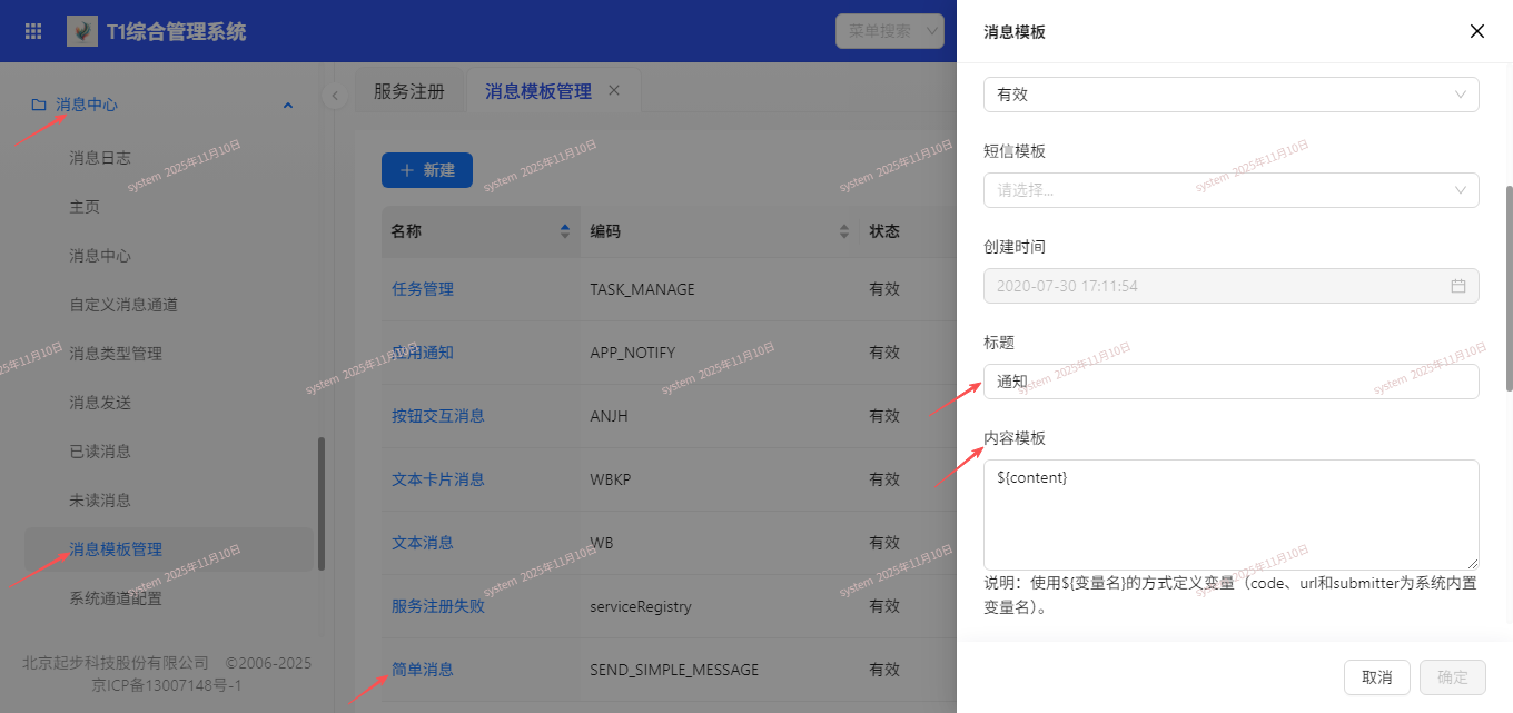在“消息中心-消息模板管理”中定义消息模板,消息模板包括:编码(消息发送接口使用)、名称、标题、内容模板、短信模板(发短信时使用)、链接(点击消息打开的页面)、发送方式和接收者等内容。
