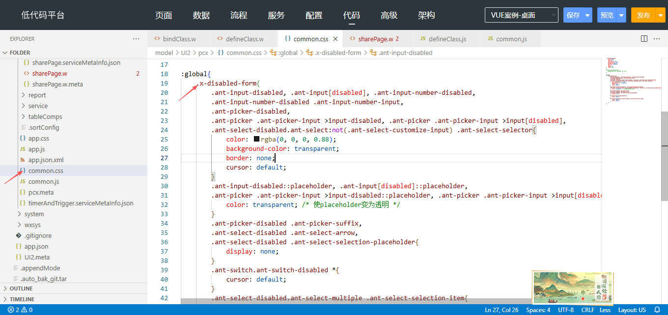 整个应用全局样式在 UI2/pcx/common.css 文件中定义,使用 :global 包含组件样式,示例代码如下