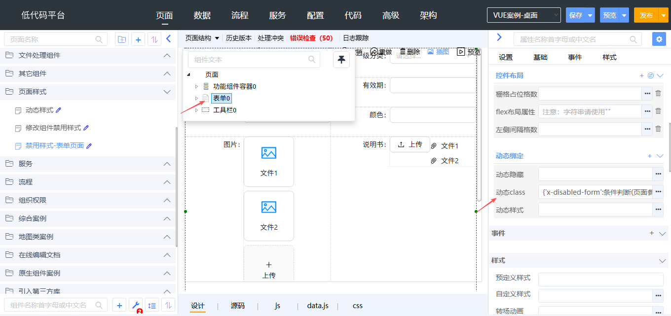 给表单组件设置“动态 class”属性,当“页面参数.动作”等于 view 时,给表单组件添加 x-disabled-form 样式,设计界面如下图所示