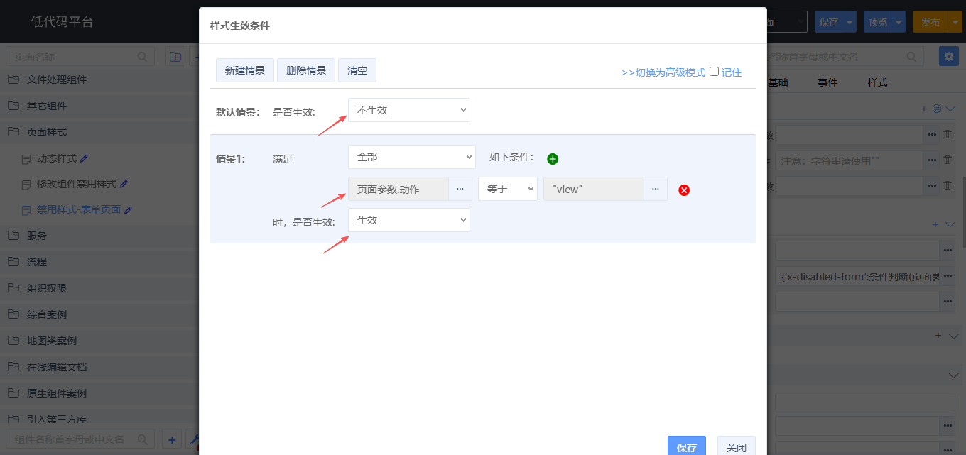 点击生效条件右侧的...按钮,打开“样式生效条件”对话框,如下图所示,设置条件为:当“页面参数.动作”等于 view 时生效,否则不生效