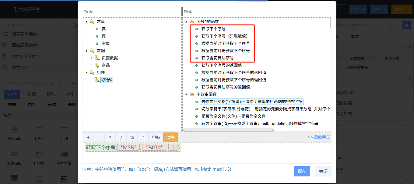 | 根据当前月份获取下个序号 | nextByMonth | key,format | nextByMonth("MSN","%05d") -> MSN20240500004 |