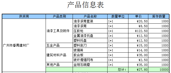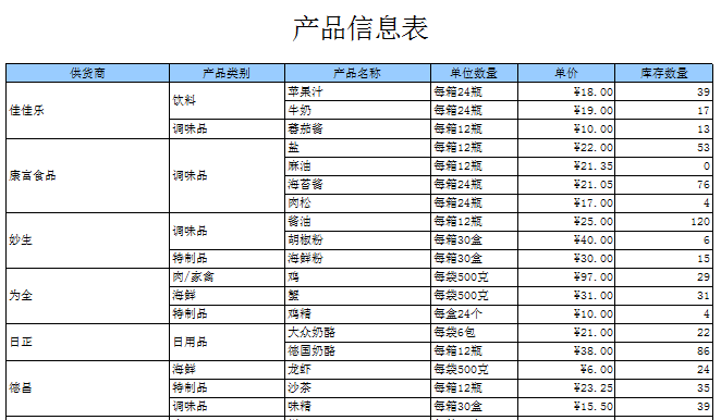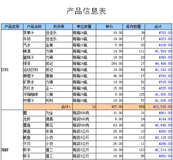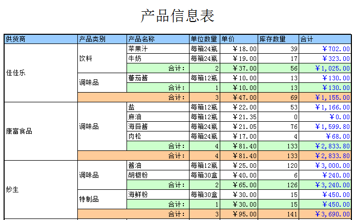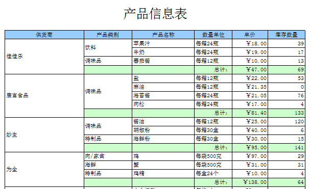 # 在F6中,输入表达式=SUM(F5),表示每个供货商中每个产品类别的各产品的单价之和。