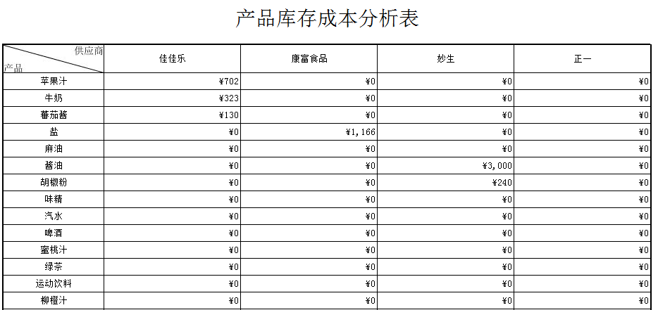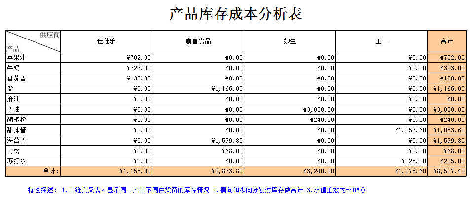 # 在D5中,输入=SUM(C5),表示计算所有供应商的每个产品名称的采购成本(单价x库存数量)合计。