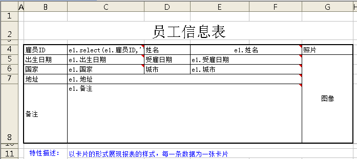 卡片式报表在其他报表工具中,有称其为“自由报表”,它是将数据库表中的每一条数据都以一个卡片的形式展现,在这一节,我们讲解一下卡片报表在X5report中的设计。