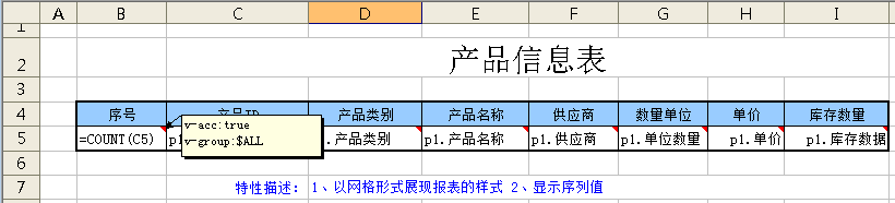 # 在B5中,输入=COUNT(C5),并添加批注v-acc:true、v-group:$ALL,表示根据C5单元格的全部数据进行序号递增。