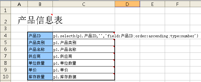 如:产品信息表需要按照产品单价排序,那么我们要在单元格内写:p1.select(p1.产品名称,'','field:单价;order:ascending;type:number')