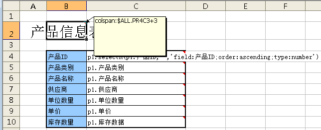 # 在B2中,输入标题,添加批注colspan:$ALL.PR4C3 $PR4C3,表示标题根据第四行第三列的数据进行扩展,并在最终结果上加一列(因为计算居中时要包含B列)。