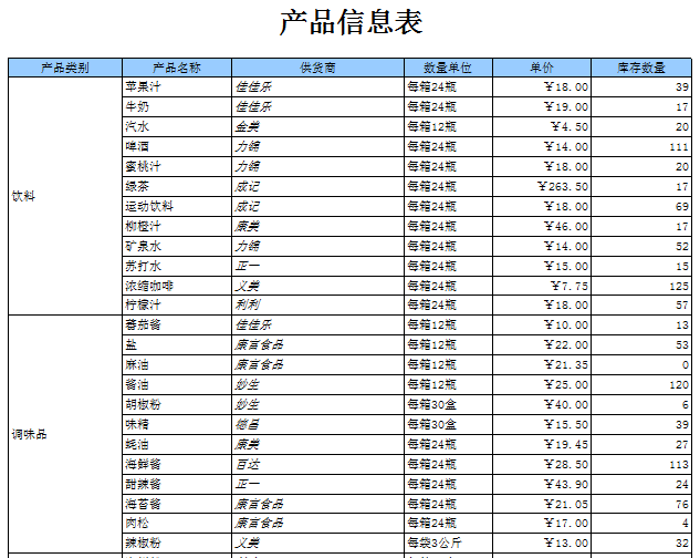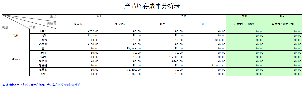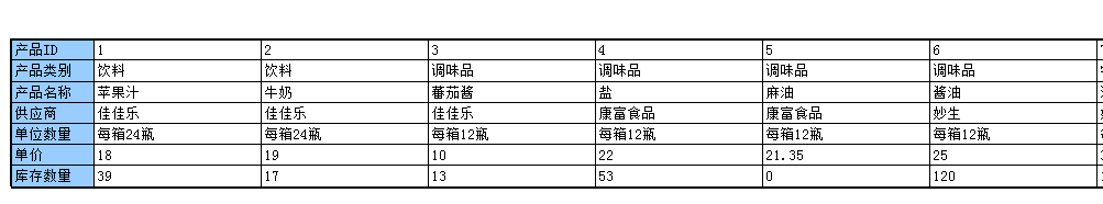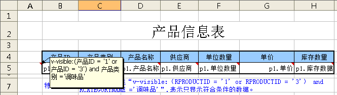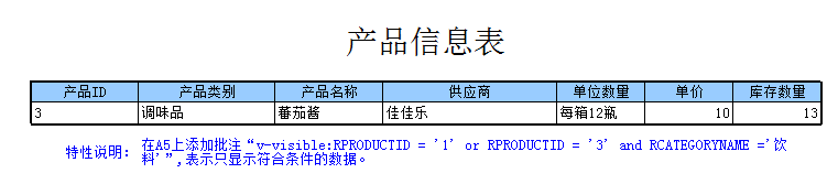 # 在A1中,添加批注v-visible:(产品ID = '1' or 产品ID = '3') and 产品类别 ='调味品',表示显示符合给定条件的数据。