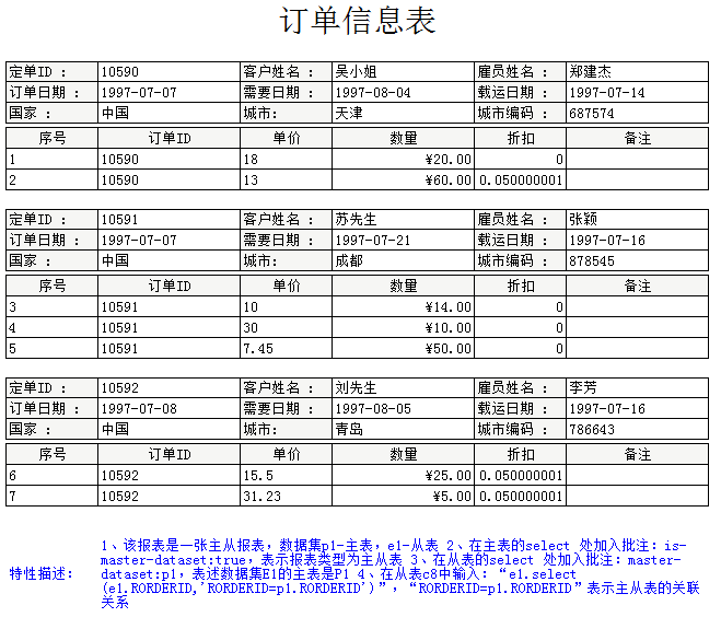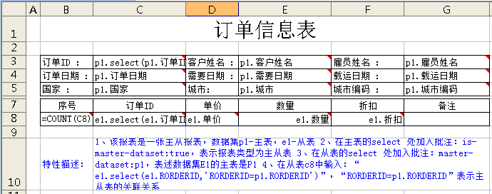如:主从报表的从表定义,e1.group(e1.订单ID,'','订单ID=p1.订单ID')