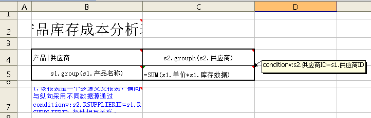 # 在C5中,添加批注conditionv:s2.供应商ID=s1.供应商ID,表示以供应商ID作为s1和s2数据集的关联关系。