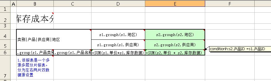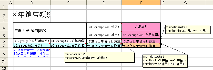 # 在E7中,添加批注main-dataset:s1和conditionh:s3.产品ID=s1.产品ID和conditionv:s2.雇员ID=s1.雇员ID,表示该单元格计算的数据必须符合批注里给定的两个关联条件。