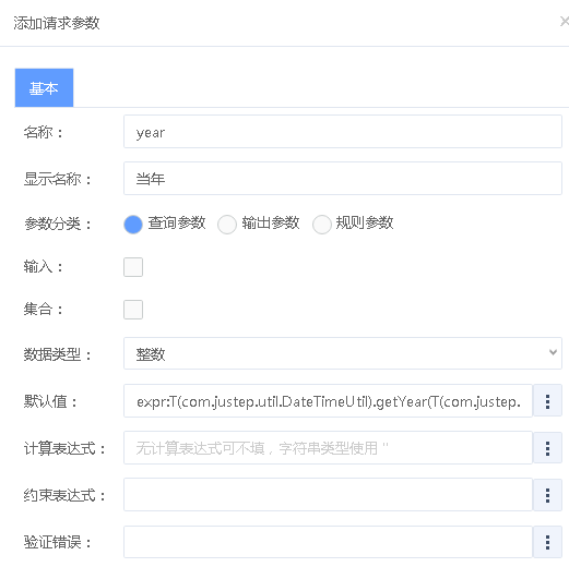 year参数,不允许前端传入,默认值为当前年份,设置如下图所示