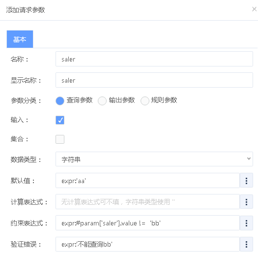 | 约束表达式 | 对当前参数的合法性校验,可以依赖别的参数和计算值 | 参数值不能等于bb:constraint="expr:#param['saler'].value != 'bb'" |