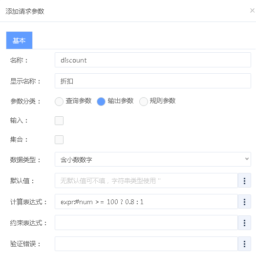 | 计算表达式 | 优先级高于默认值,可以依赖别的参数,不能依赖别的计算值 | 使用条件:value="expr:#num >= 100 ? 0.8 : 1" |