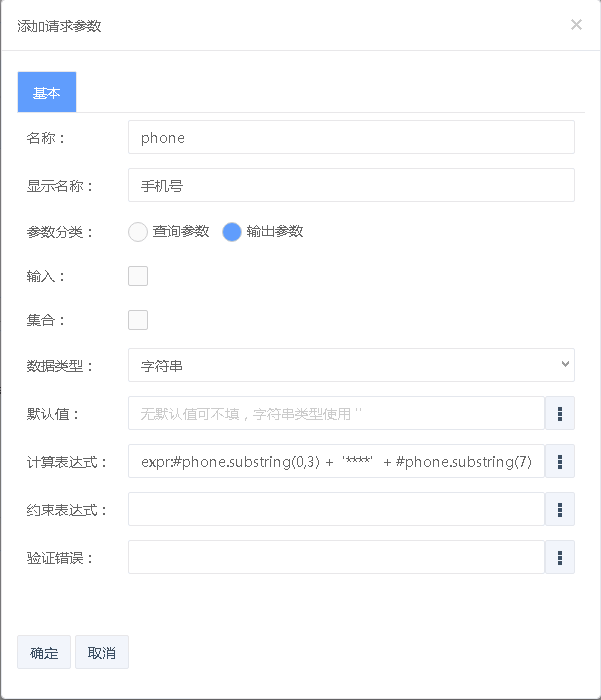 固定值:defaultValue="expr:'aa'" 手机号脱敏:defaultValue="expr:#phone.substring(0,3) + '**' + #phone.substring(7)" |