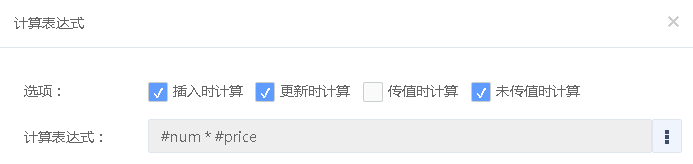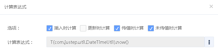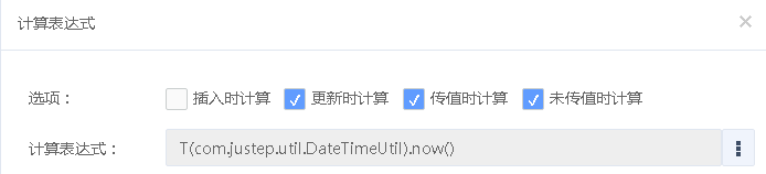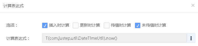 计算时机的选项分别是:插入时计算、更新时计算、传值时计算和未传值时计算。插入时计算和更新时计算必须选择其一或全选,传值时计算和未传值时计算也必须选择其一或全选。计算表达式是Spring表达式。
