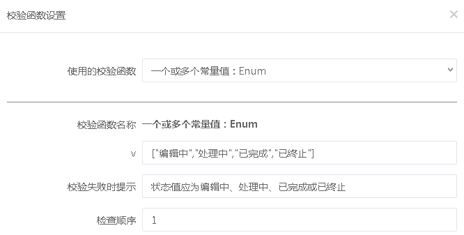 一个数据列设置一个约束规则,一个约束规则可以包括多个校验函数,通过校验函数实现验证数据的合法性。每个校验函数包括参数、校验失败时的提示和校验顺序。通过设置校验顺序控制校验函数的执行次序。