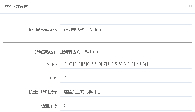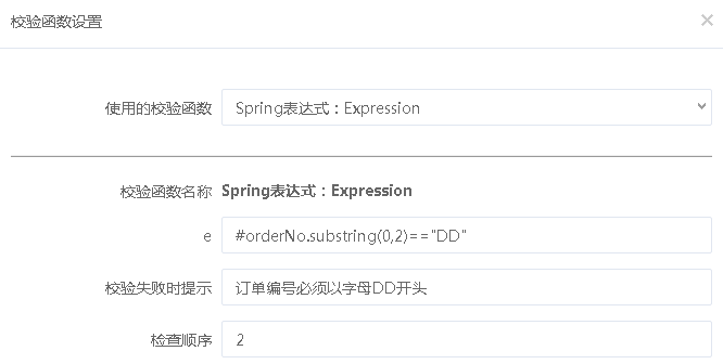 系统提供的校验函数如下 | 函数名 | 参数 | 说明 | | --- | --- | --- | | 数值范围 | min最小值 max最大值 | 在最小值和最大值之间 | | 整数最大值 | value指定值 | 验证值是否小于等于value | | 整数最小值 | value指定值 | 验证值是否大于等于value | | 浮点数最大值 | value指定值 | 验证值是否小于等于value | | 浮点数最小值 | value指定值 | 验证值是否大于等于value | | 数字格式 | integer整数位数 fraction小数位数 | 验证值的整数位数和小数位数上限 | | 非空 | | 验证值不是null | | 是空 | | 验证值是null | | 字符串非空 | | 验证字符串长度不为0、集合大小不为0 | | 字符串长度 | min最小值 max最大值 | 验证字符串长度是否在min和max区间内 | | 过去时间 | | 验证是否比当前时间早 | | 未来时间 | | 验证是否比当前时间晚 | | 邮件地址验证 | | 验证值是否是Email格式 | | 一个或多个常量值 | v 常量字符串数组 | 验证值是否在常量字符串数组内 | | 正则表达式 | regex正则表达式 flag标志 | 验证是否满足正则表达式,flag 参考 Pattern.compile(String regex, int flag)方法中的flag | | Spring表达式 | e Spring表达式,表达式中使用“#列标识”获取列值 | 验证是否满足Spring表达式,例如订单编号必须以DD开头,#orderNo.substring(0,2)=="DD" |