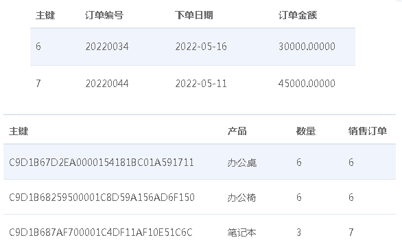 DBRest支持主从数据的单独分别获取,也支持形成JSON嵌套数据一起返回。例如:有如下图所示的两条主表数据,以及对应的3条从表数据。