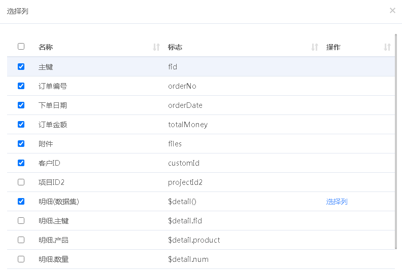 主数据集设置输出数据集后,主数据集的数据列中就包括了输出数据集和输出数据集的各个列,在数据集属性编辑的数据列中勾选需要返回的列,如下图所示: